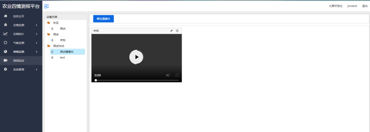 監(jiān)控主頁顯示設(shè)備列表、大屏可視化、地圖展示等菜單信息。顯示土壤墑情、蟲情、氣象監(jiān)測圖標(biāo)及設(shè)備的運(yùn)行狀態(tài)。